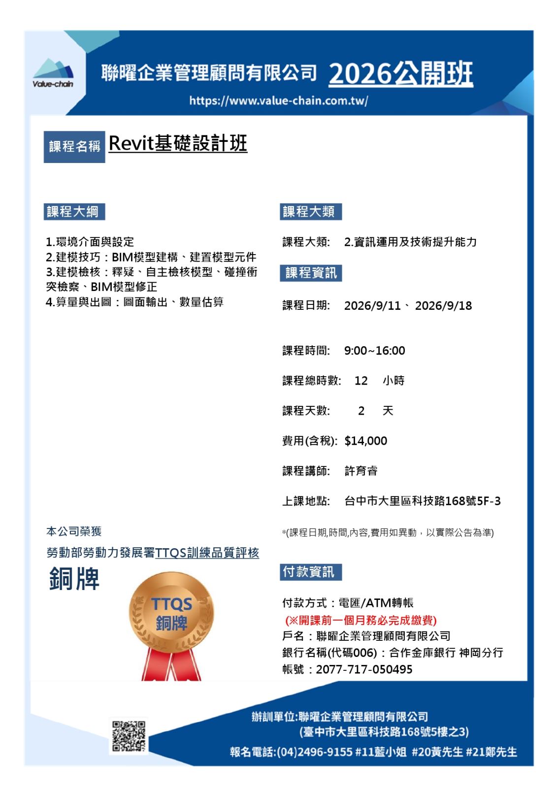 - 課程日期 : 2026/9/11、2026/9/18 (共2天)
