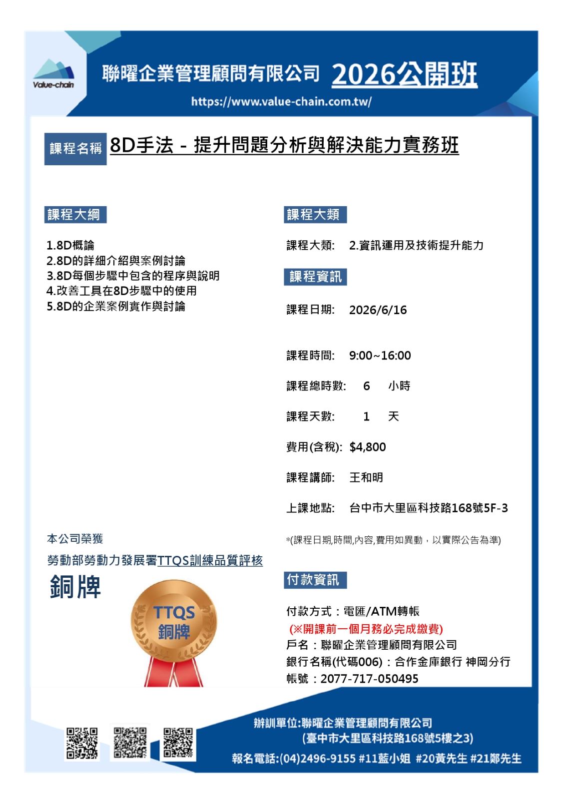 【2026公開班】8D手法-提升問題分析與解決能力實務班