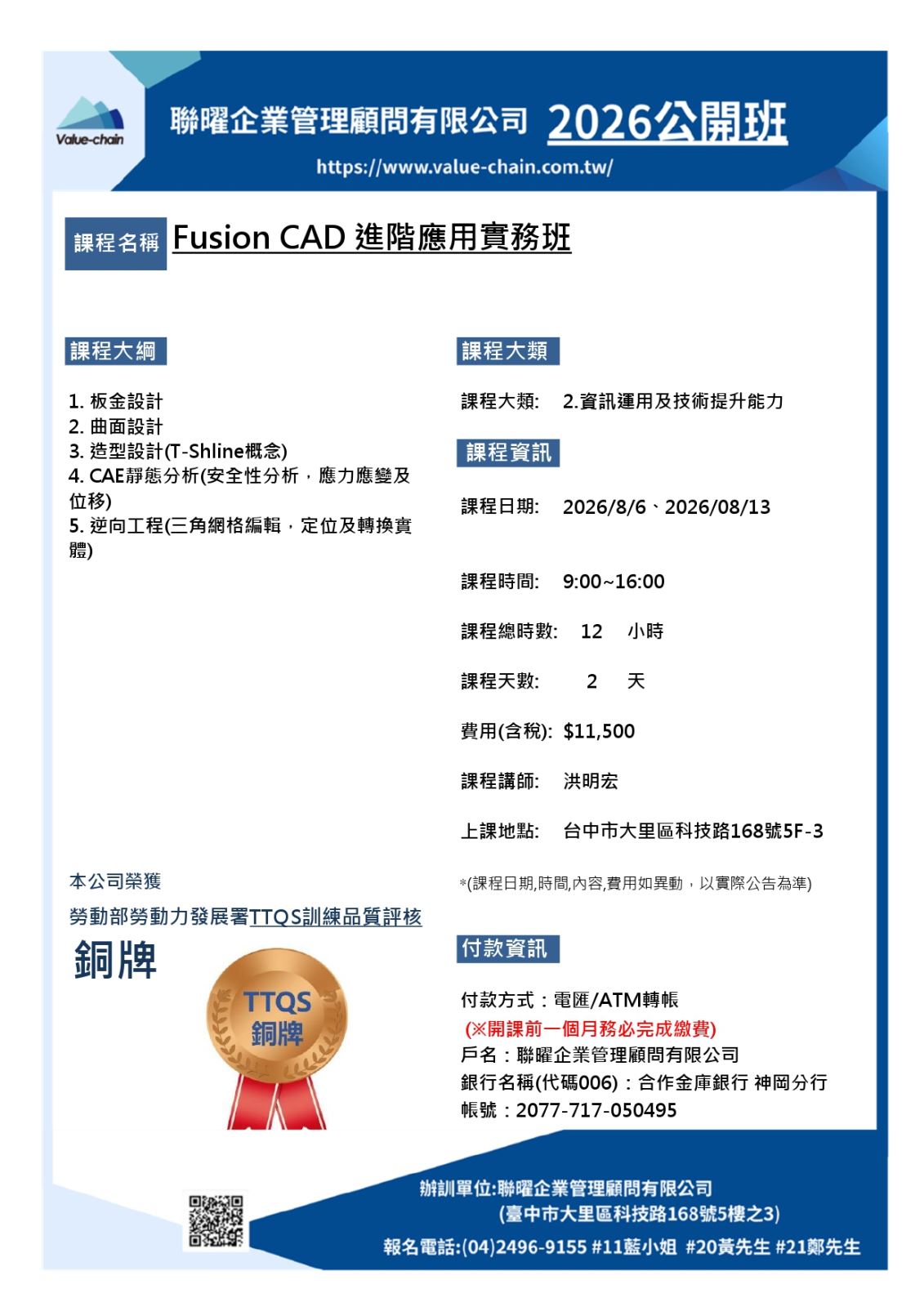 本課程整合進階產品設計與工程分析應用,從板金設計與曲面設計基礎切入,協助學員掌握結構與外觀兼顧的建模技巧,並透過造型設計中的 T-Spline 概念,提升複雜曲面與自由造型的設計能力。課程進一步導入 CAE 靜態分析,說明安全性評估、應力應變與位移分析的應用方式,強化設計階段的工程驗證能力。同時涵蓋逆向工程實務,包含三角網格編輯、模型定位與實體轉換,協助學員整合設計、分析與重建流程,建立可銜接實際產品開發的完整應用能力。