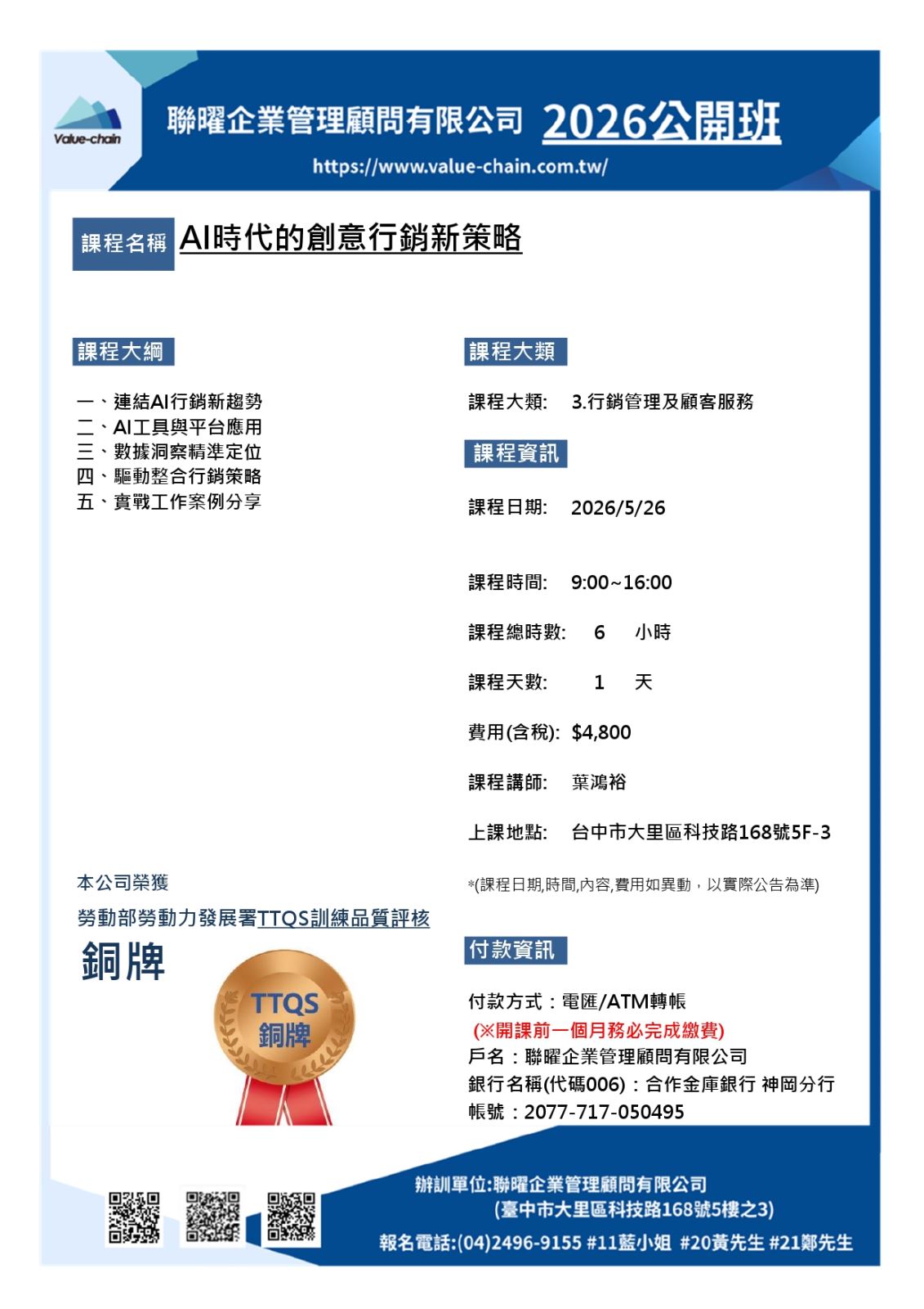 本課程聚焦於 AI 驅動的行銷轉型實務,從全球 AI 行銷新趨勢切入,協助學員掌握數位環境下的策略變革方向。課程將系統化介紹各類 AI 工具與平台應用方式,說明如何透過數據洞察進行精準市場定位與受眾分析,提升行銷決策品質。進一步整合數據、內容與通路資源,建構可執行的整合行銷策略,並透過實戰工作案例分享,強化學員在實務情境中的應用能力與策略思維。