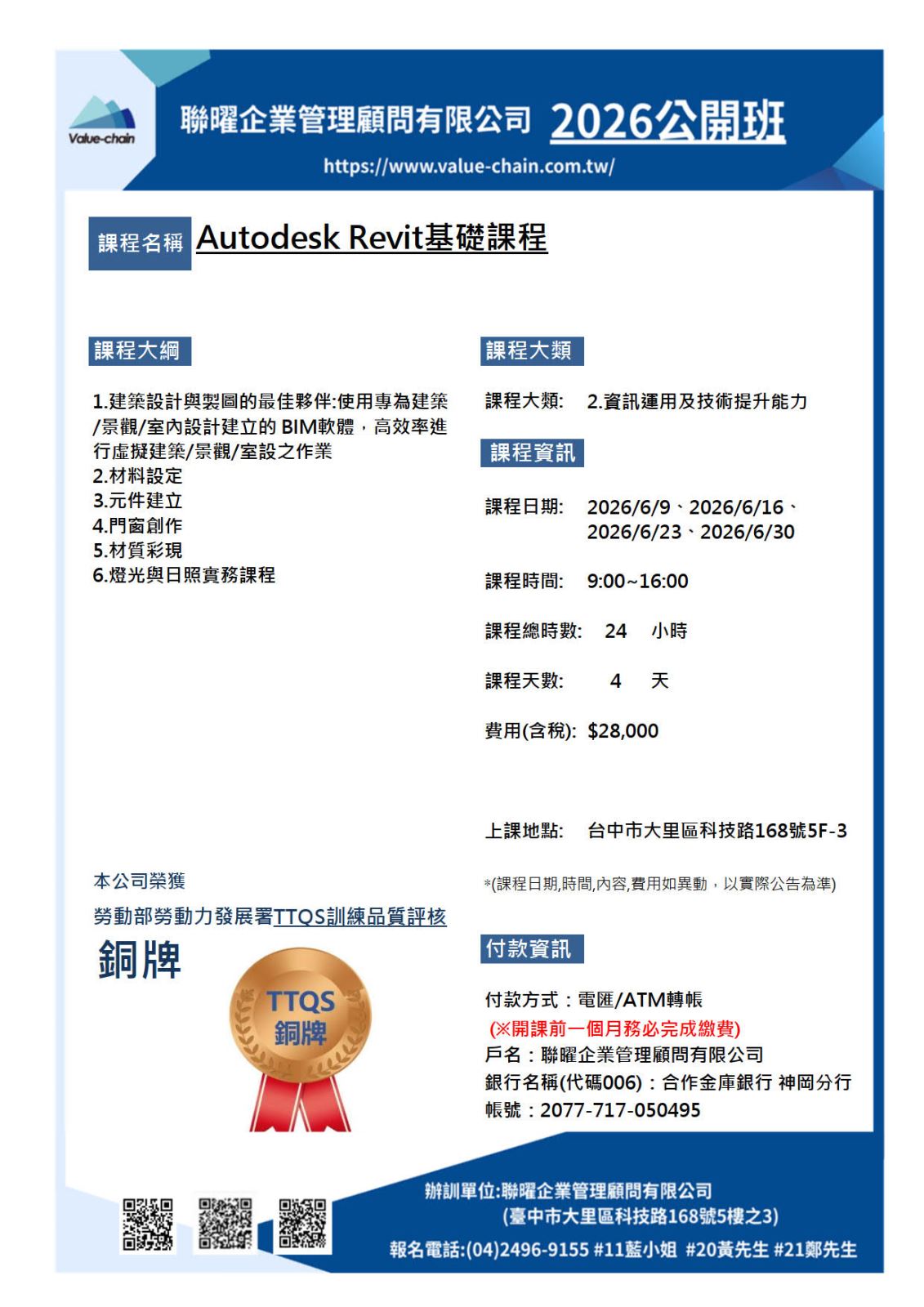 1.建築設計與製圖的最佳夥伴:使用專為建築/景觀/室內設計建立的 BIM軟體,高效率進行虛擬建築/景觀/室設之作業 2.材料設定 3.元件建立 4.門窗創作 5.材質彩現 6.燈光與日照實務課程