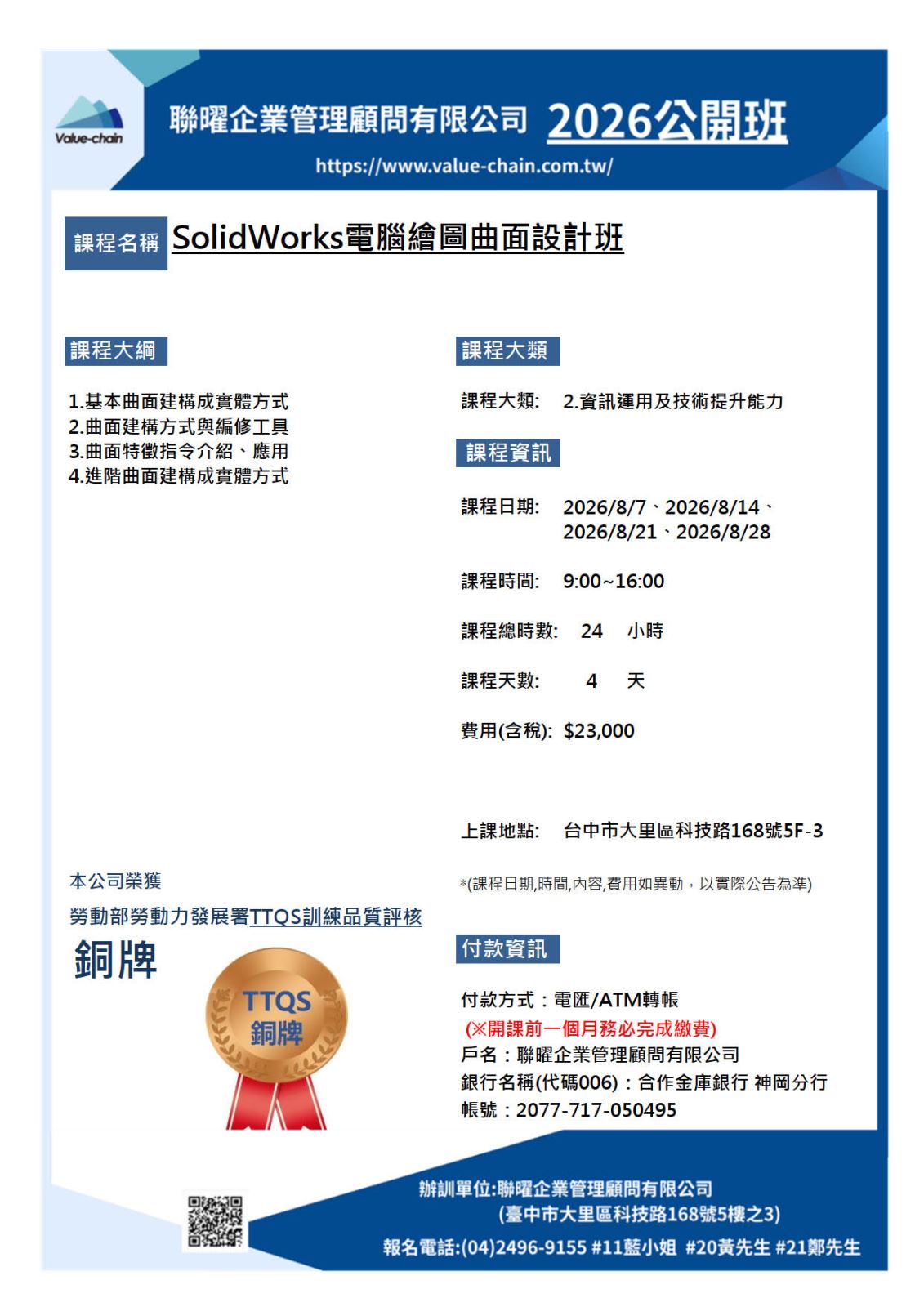 課程名稱 SolidWorks電腦繪圖曲面設計班