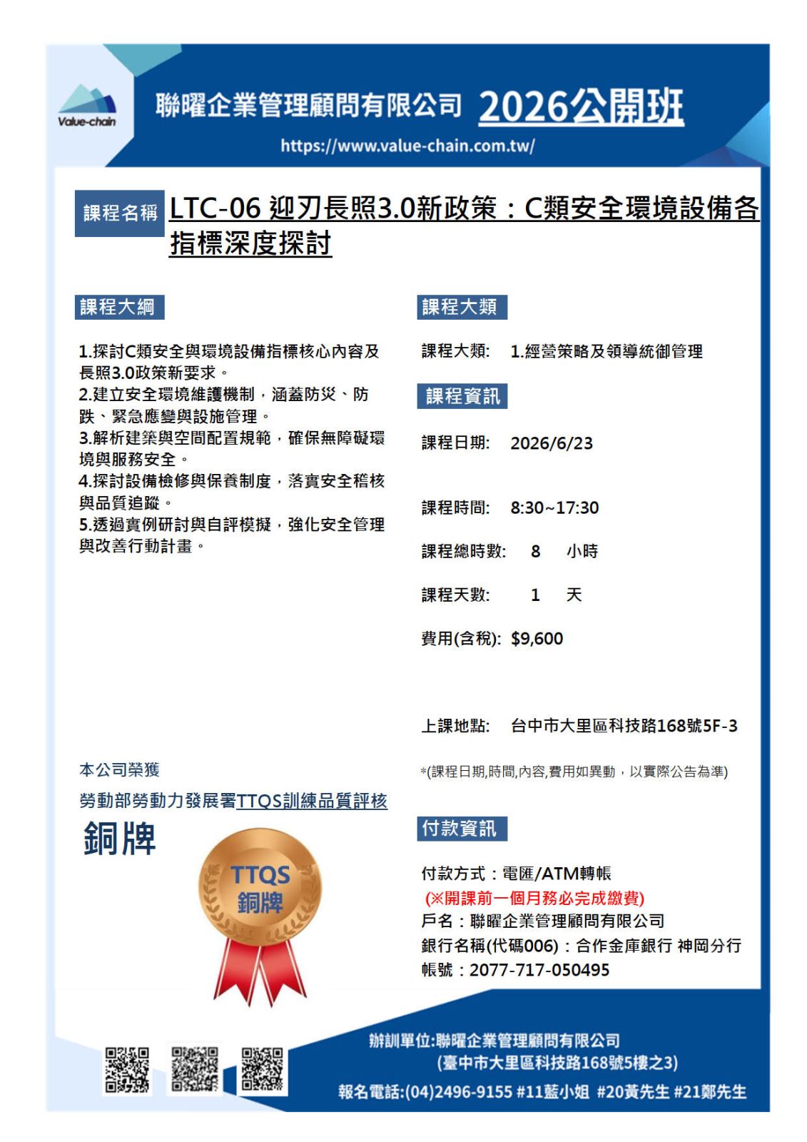 1.探討C類安全與環境設備指標核心內容及長照3.0政策新要求。 2.建立安全環境維護機制,涵蓋防災、防跌、緊急應變與設施管理。 3.解析建築與空間配置規範,確保無障礙環境與服務安全。 4.探討設備檢修與保養制度,落實安全稽核與品質追蹤。 5.透過實例研討與自評模擬,強化安全管理與改善行動計畫。