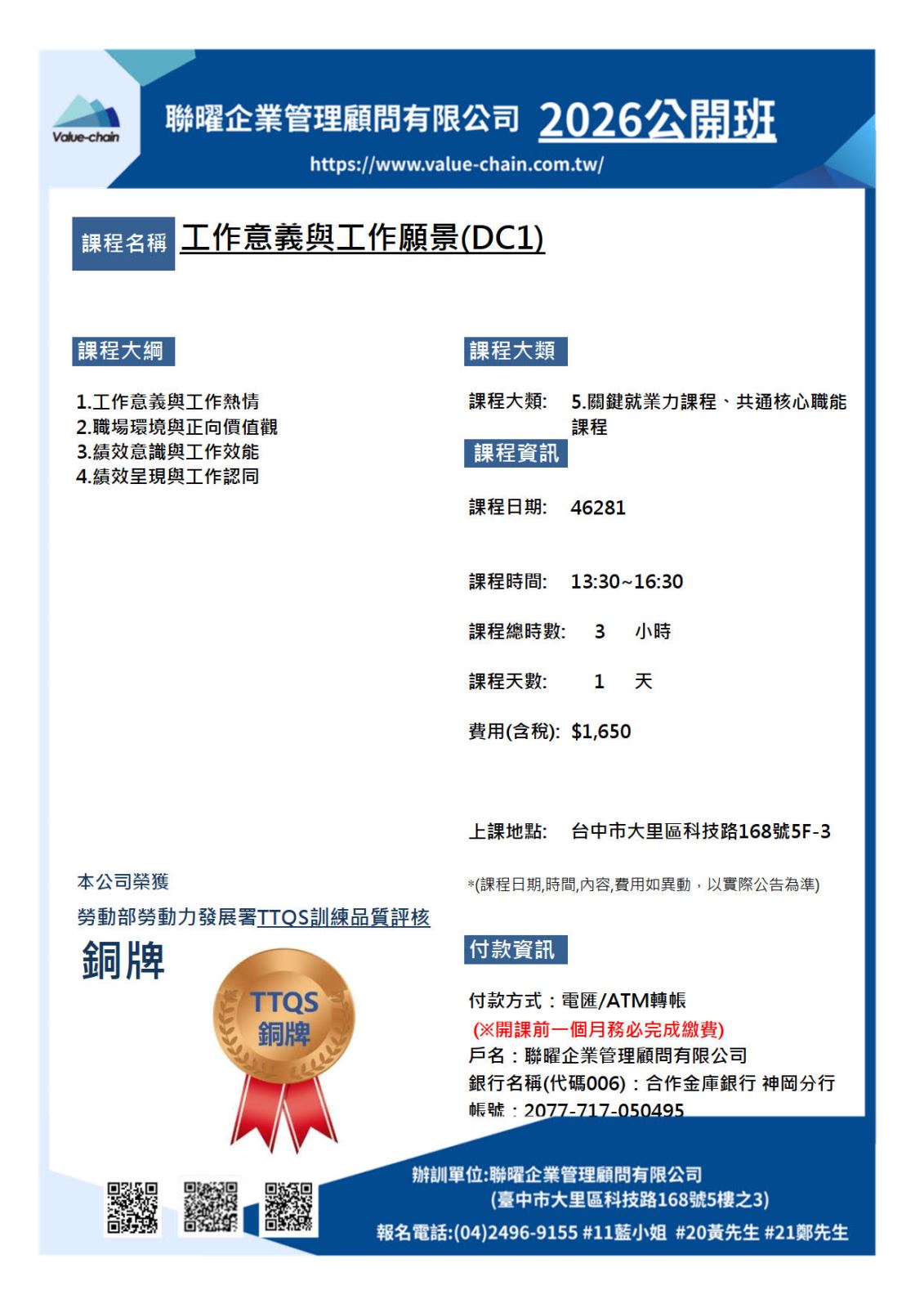 1.工作意義與工作熱情 2.職場環境與正向價值觀 3.績效意識與工作效能 4.績效呈現與工作認同